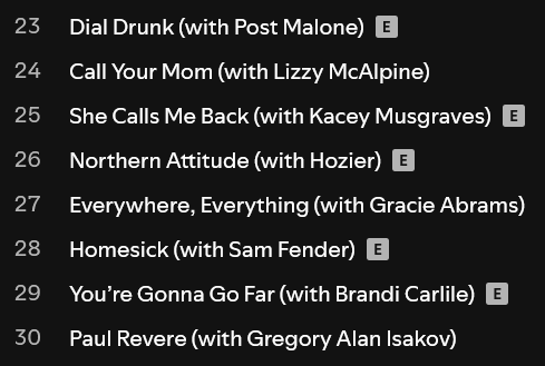 It officially did on July 18th when Post Malone was featured on Dial Drunk, a ridiculous excuse to chart off name recognition. Stick Season (Forever) has *SEVEN* of these songs featuring the likes of the aforementioned Postie, Lizzy McAlpine, Kacey Musgraves (<3), Hozier, Gracie Abrams, Sam Fender, Brandi Carlile, and Gregory Alan Isakov. Only one of these features adds anything to the song – Post Malones’ – and I still prefer the original.